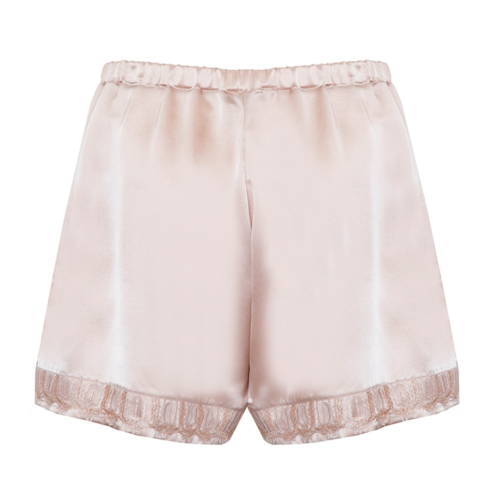 Soft silk is framed with lace at the leg openings. The waistband is gently elasticated and finished with a fixed tie.