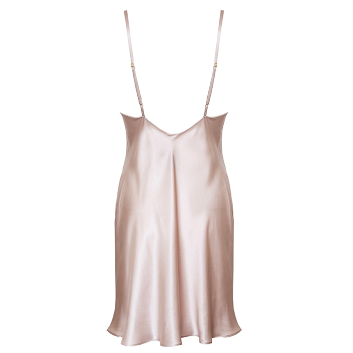 An elegant design, with silk cut on the bias to give a figure skimming fit and spaghetti shoulder straps. An overlay of lace at the centre front enhances the design details.