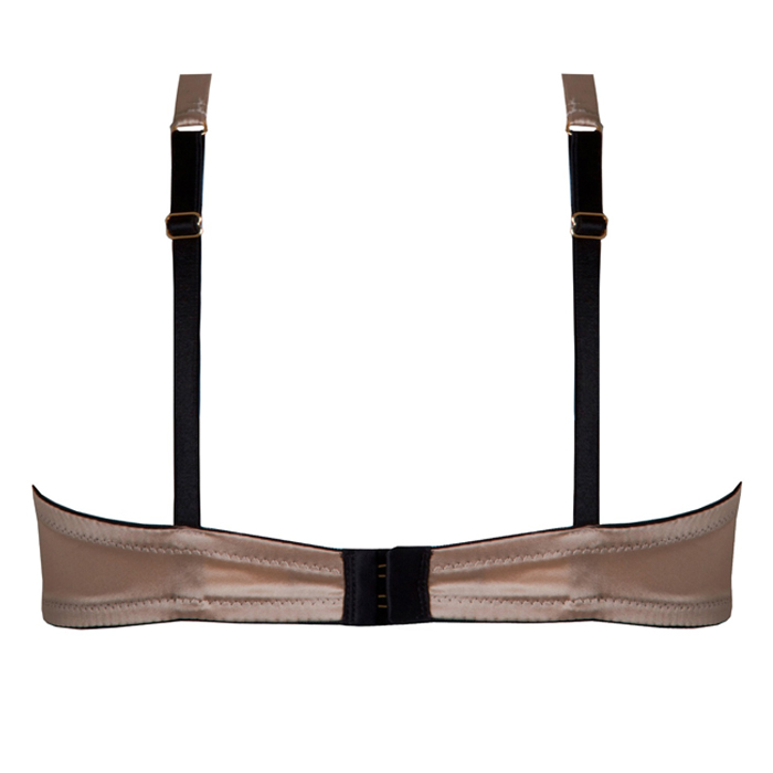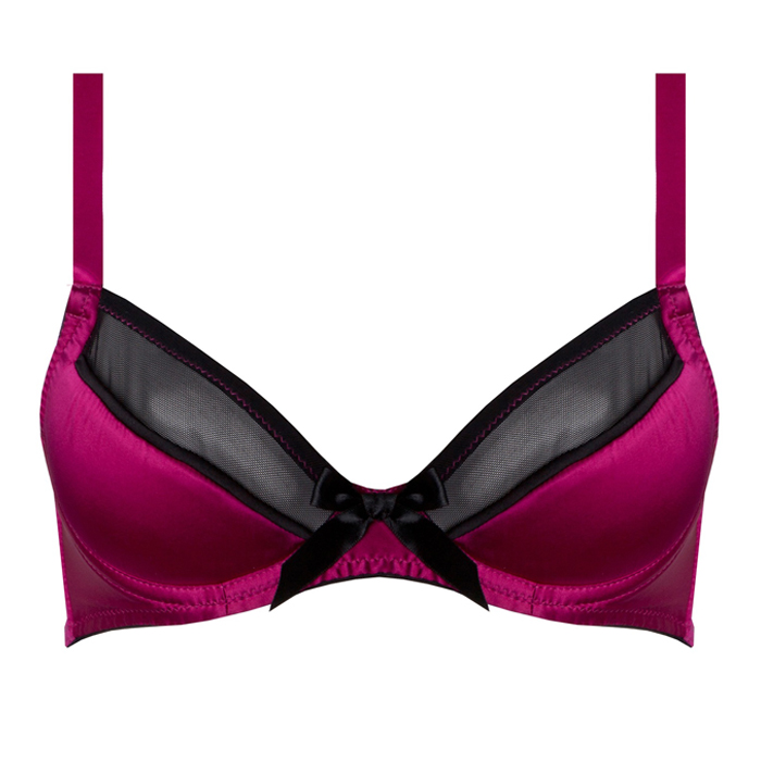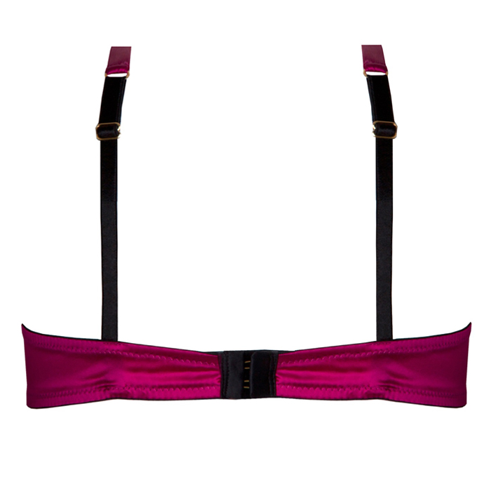 This half-padded bra is made from silk satin (including the underband, cups’ lining and shoulder straps) with black sheer mesh inserts contrasted by a piped satin seam. Both luxurious and functional, the Casino plunge bra provides support and uplift for an enhanced cleavage.