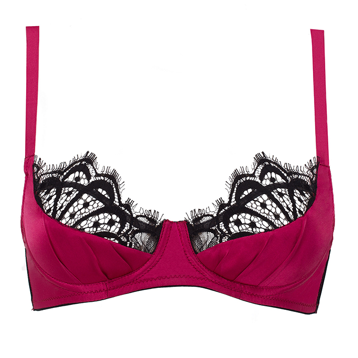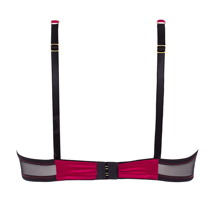 This eye-catching balcony bra features gently padded silk lower cups surmounted by French Leavers lace. The cups are lined with silk, and three theatrical pleats fit around the bust. The cradle and shoulder straps are also in delicious raspberry silk satin, whilst the rest of the underband has contrasting panels of black sheer mesh to echo the matching briefs & thong’s design. The carefully hand-cut lace placements are highlighted by delicate topstitching, and the hardware is plated in 24 ct gold.