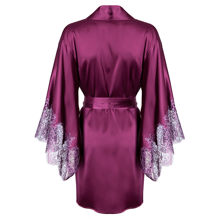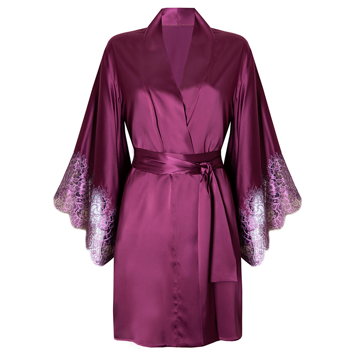 A beautiful kimono robe in a rich winter berry shade of soft silk. French lace is appliqued to the sleeve for a dramatic and luxurious finish.