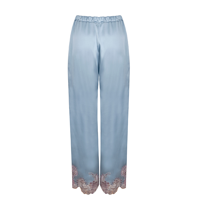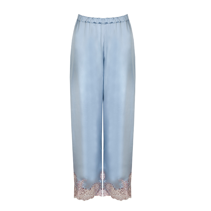 straight leg pyjama trouser, decoratively embellished with appliqued lace at the leg hems.
